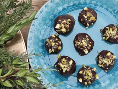Tilfar 200g frískar dadlur (koyr steinarnar burtur) 60g pistasiunøtir 80g myrk sjokoláta 10g pistasiunøtur til pynt omaná Soleiðis gert tú: Blenda dadlur og pistasiunøtur í eini hvirlu. Ger hendurnar vátar og forma deiggið í smáar kúlur. Smelta sjokolátuna evt í mikroovninum (360W í uml 1 min og 30 sek) ella yvir vatnbað. Vend kúlunum í sjokolátu og legg á eitt fat við bakipappíri á. Drússa við hakkaðum pistasiunøtum omanyvir og stilla á køl ella í frystaran.