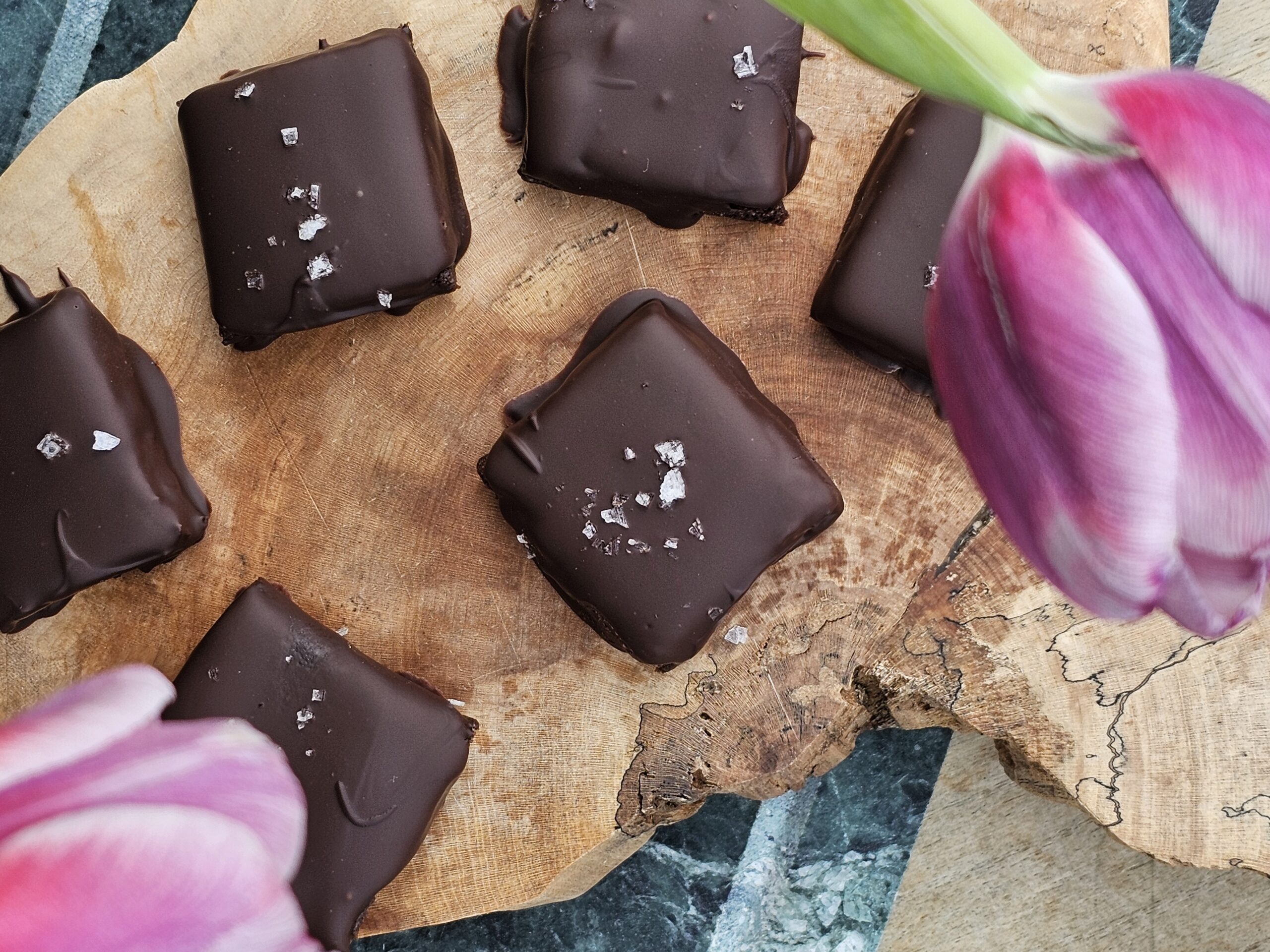 Endurtak við øllum 24 bitunum. Stroya eventuelt eitt sindur av flakasalti omanyvir, og set bitarnar á køl, til sjokolátan er stívnað.